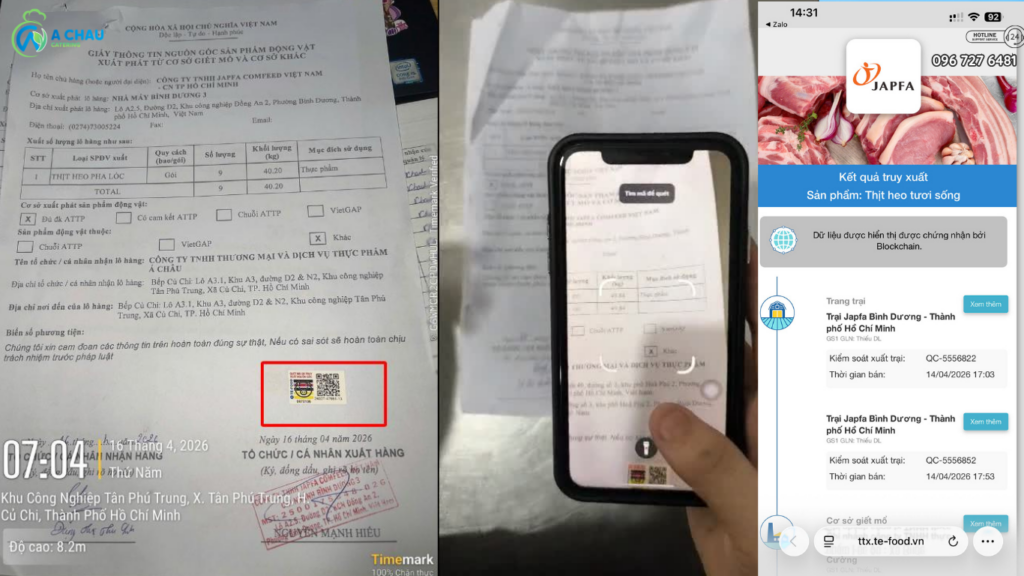 Truy xuất kỹ thuật số: Nhân viên QA/QC quét mã QR để xác nhận dữ liệu trên hệ thống khớp với giấy tờ thực tế (như hình 2 & 3).